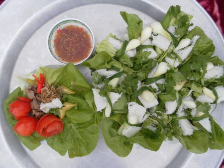 Nguyên liệu đểm làm món bánh cuốn gồm ruốc khô (có nơi gọi là huyết) rửa sạch để cho ráo nước, đem lên bếp rang với mật. Thịt lợn nạc cắt miếng nhỏ rang mặn ngọt. Xà lách và hành rửa nhẹ nhàng từng lá, tránh làm bầm dập. Hành sau khi rửa sạch nhúng qua nước sôi cho lá hành dai và củ hành bớt hăng. Khế chua cắt miếng vừa, ghém với một chút ruốc, chút thịt, chút ngò. Tất cả gói trong một chiếc lá xà lách, gài thêm một miếng bún lá vừa miệng, một cọng ngò cho đẹp mắt rồi buộc một cây hành chấm với nước mắm thế là ăn!