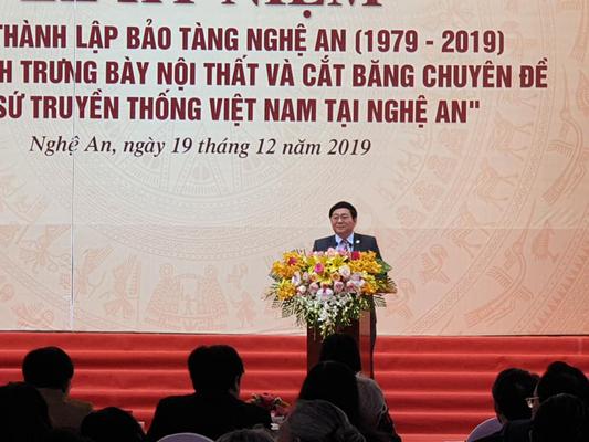 Sáng nay, ngày 19/12/2019 hòa trong không khí hân hoan chào mừng các sự kiện trọng đại của dân tộc, kỷ niệm lần thứ 73 năm ngày Chủ tịch Hồ Chí Minh ra lời kêu gọi toàn quốc kháng chiến (19/12/1946 - 19/12/2019), kỷ niệm 75 năm ngày thành lập quân đội nhân dân Việt Nam (22/12/1944 - 22/12/2019) và 30 năm ngày Hội quốc phòng toàn dân (22/12/1989 - 22/12/2019) tại Bảo tàng Nghệ An đã tổ chức Lễ Kỷ niệm 40 năm ngày thành lập, cắt băng khánh thành trưng bày nội thất, trưng bày chuyên đề "Gốm sứ truyền thống Việt Nam tại Nghệ An" và đón nhận bức trướng của UBND tỉnh trao tặng.