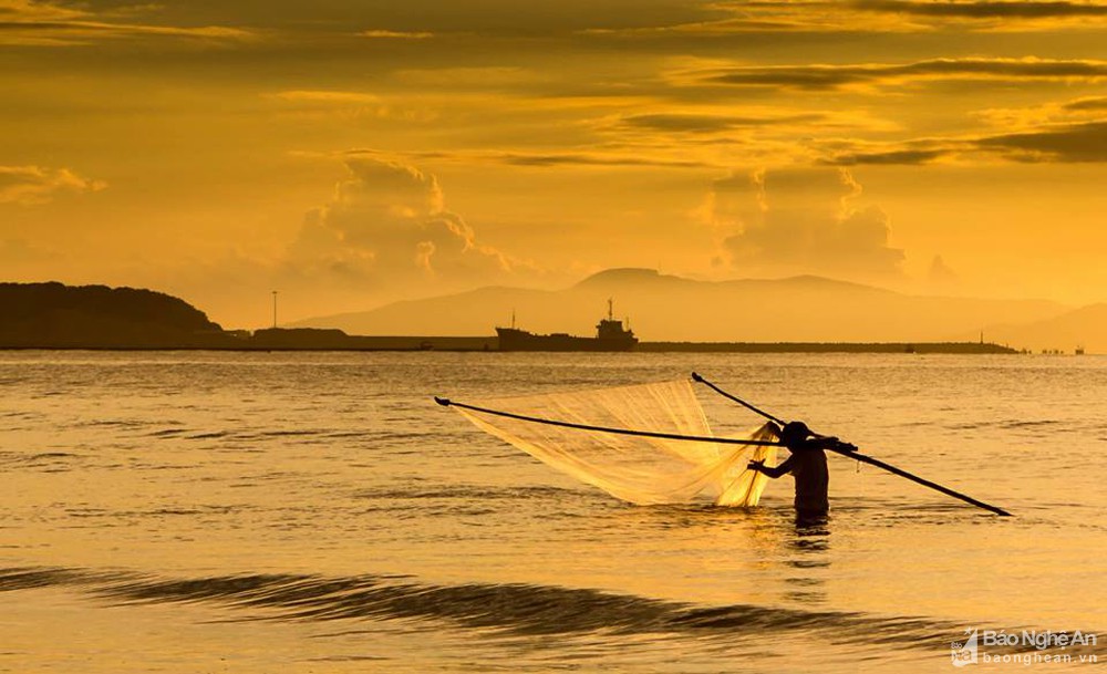 Ngư dân thả lưới trong ánh nắng sáng mai ở xóm biển Tân Minh. Ảnh: Duy Sơn