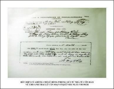 * Bức điện được gửi từ bưu điện Nhà tù Côn Đảo về nhà anh trai Lê Văn Soạn (tức Hương Choắt). Đây là bút tích cuối cùng của đồng chí Lê Hồng Phong trước khi hy sinh.