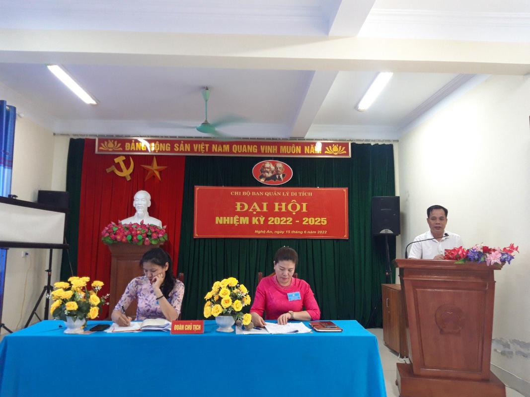 Thực hiện Hướng dẫn số 06- HD/ĐUK, ngày 25/3/2022 của Ban Thường vụ Đảng ủy Khối các cơ quan tỉnh về Hướng dẫn chuẩn bị và tổ chức đại hội chi bộ trực thuộc đảng ủy bộ phận, đảng ủy cơ sở nhiệm kỳ 2022 - 2025; Kế hoạch số 294 - KH/ĐU, ngày 31/3/2022 của Đảng ủy Sở Văn hóa và Thể thao về chỉ đạo chuẩn bị và tổ chức đại hội chi bộ trực thuộc Đảng ủy bộ phận, Đảng ủy Sở nhiệm kỳ 2022 – 2025; chiều ngày 15/6/2022, Chi bộ Ban quản lý Di tích Nghệ An đã tổ chức thành công Đại hội Chi bộ nhiệm kỳ 2022-2025.