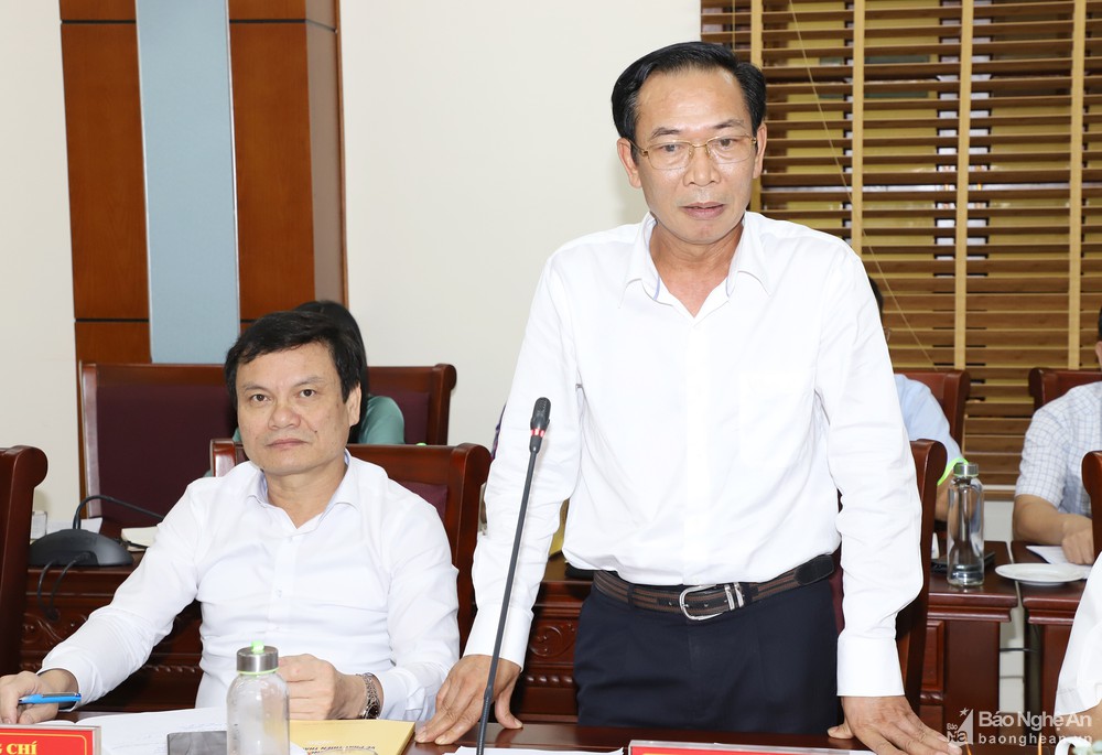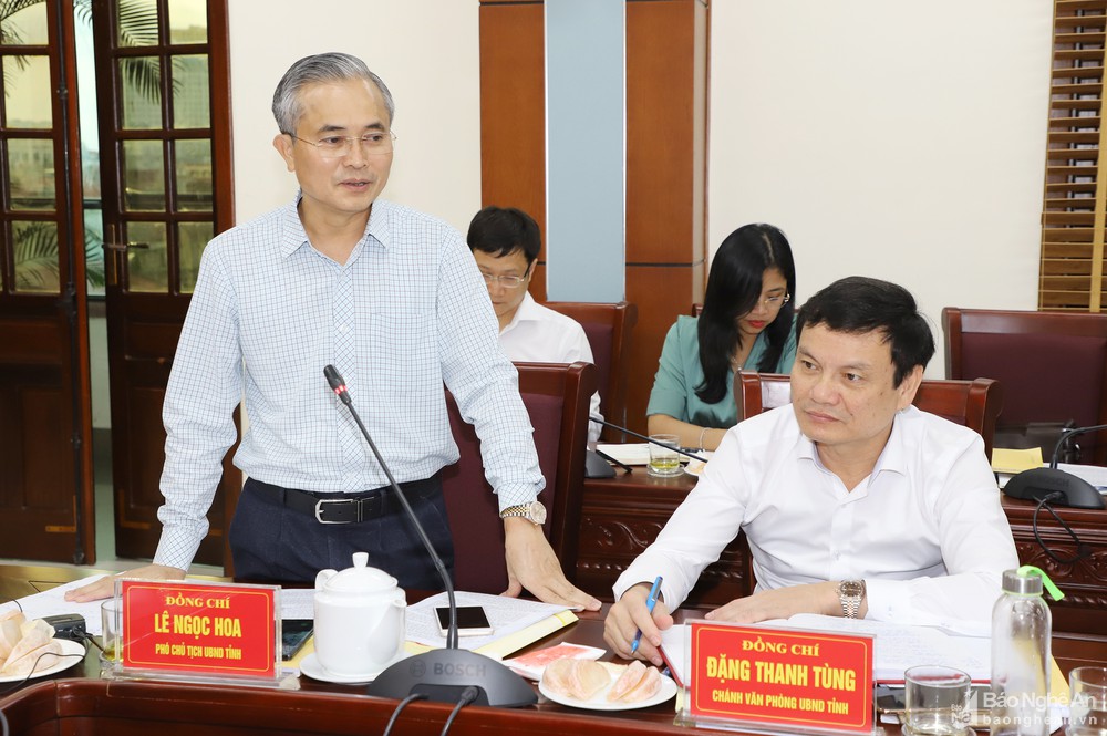 Phó Chủ tịch UBND tỉnh Lê Ngọc Hoa phát biểu tại buổi làm việc. Ảnh: Phạm BằngPhó Chủ tịch UBND tỉnh cũng nhấn mạnh, TP. Vinh cần quy hoạch để có cơ sở hạ tầng thật tốt tại các CCN, qua đó thu hút nhiều doanh nghiệp sản xuất các sản phẩm công nghệ cao, chuẩn bị hạ tầng tạo tiền đề cho mở rộng không gian đô thị thành phố Vinh.