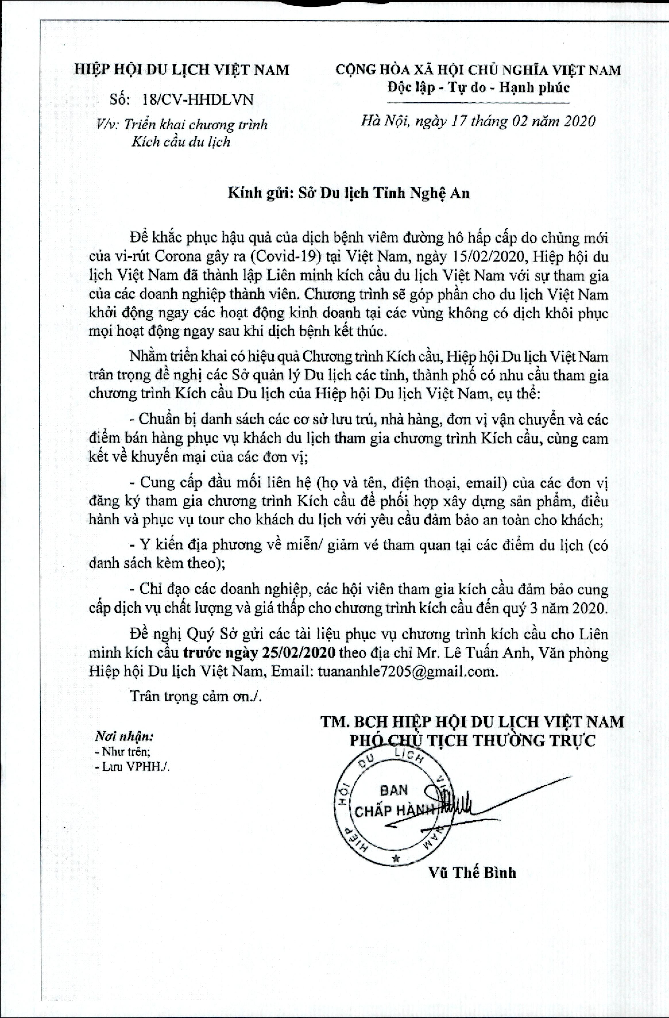 Để góp phần tăng lượng khách du lịch đến Nghệ An trong giai đoạn khó khăn hiện nay, rất mong các doanh nghiệp, cơ sở kinh doanh dịch vụ du lịch, khu, tuyến điểm du lịch trong tỉnh tích cực hưởng ứng Chương trình kích cầu du lịch.