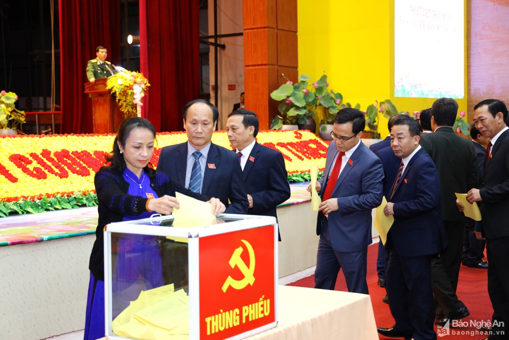 Đoàn Chủ tịch bỏ phiếu bầu Ban Chấp hành Đảng bộ tỉnh khóa XIX. Ảnh: Thành Cường Theo cơ cấu, Ban Chấp hành Đảng bộ tỉnh Nghệ An khóa XIX, nhiệm kỳ 2020 - 2025 có số lượng 66 đồng chí (bao gồm 1 đồng chí do Trung ương luân chuyển tăng thêm). So với nhiệm kỳ 2015 - 2020, số lượng Ủy viên Ban Chấp hành Đảng bộ tỉnh Nghệ An khóa XIX, nhiệm kỳ 2020 - 2025 giảm 5 đồng chí, tương đương 7%. Trong đó, tại Đại hội bầu 64 đồng chí (khuyết 2).