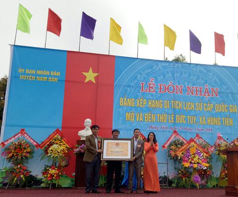 Nằm cạnh con đê Tả Lam, soi bóng xuống Bàu Sen thơ mộng Di tích lịch sử quốc gia Mộ và Đền thờ ngài Lê Đức Tuy như một bức tranh thơ mộng, vừa uy nghiêm, cổ kính. Đền thờ được xây dựng vào đầu thế kỷ XVI để thờ vị quan Vinh Phúc bá Lê Đức Tuy. Người có công lớn dưới triều đại nhà Lê, làm quan quản lãnh trấn giữ vùng Anh Đô Nghệ An, Ngài là một vị quan hết lòng vì dân vì nước, được Vua Lê Thánh Tông phong sắc "Dực bảo trung hưng, linh phù tôn thần".