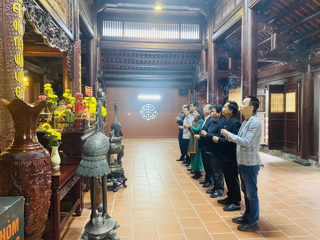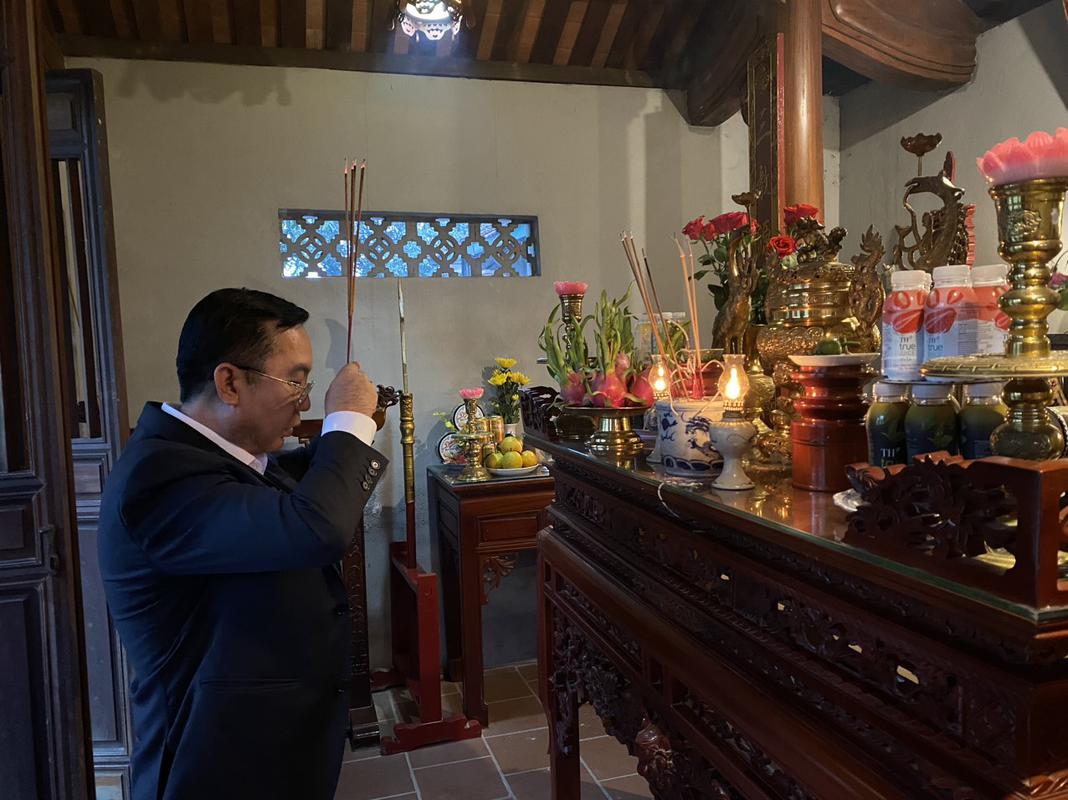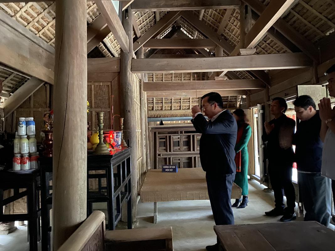 Đoàn đại biểu làm lễ dâng hương tại ngôi nhà tranh.