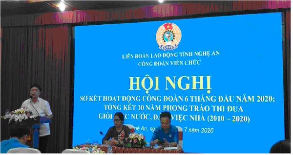 Tiếp theo là phần sơ kết hoạt động công đoàn 6 tháng đầu năm 2020. Hội nghị đã có những đánh giá về những kết quả đã làm được: tổ chức được nhiều hoạt động có ý nghĩa chào mừng các ngày lễ lớn của đất nước, của tỉnh trong năm 2020; phong trào “Toàn dân ủng hộ phòng, chống dịch Covid-19”, Vận động cán bộ, đoàn viên thực hiện tốt quy định của Đảng về nêu gương gắn với thực hiện Nghị quyết Trung ương 4; Tích cực hưởng ứng chương trình ‘Tết Sum vầy” Xuân Canh Tý - 2020 tại các cơ quan, đơn vị và hưởng ứng Tháng công nhân; Phối hợp cùng chuyên môn tổ chức có hiệu quả phong trào thi đua tại các cơ quan, đơn vị với mục tiêu hoàn thành xuất sắc nhiệm vụ chính trị trong năm 2020…