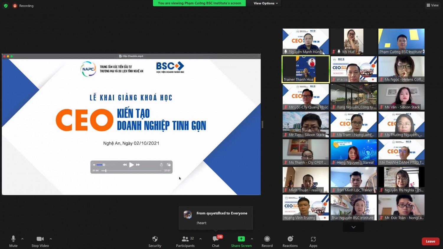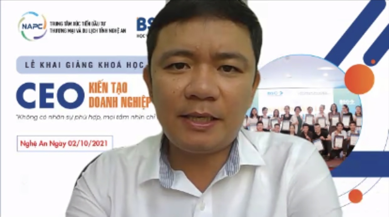 Sáng 02/10, Trung tâm Xúc tiến Đầu tư, Thương mại và Du lịch tỉnh Nghệ An phối hợp với Học viện Doanh nhân BSC tổ chức Lễ Khai giảng trực tuyến Lớp bồi dưỡng Quản trị Doanh nghiệp chuyên sâu"CEO- KIẾN TẠO DOANH NGHIỆP TINH GỌN".