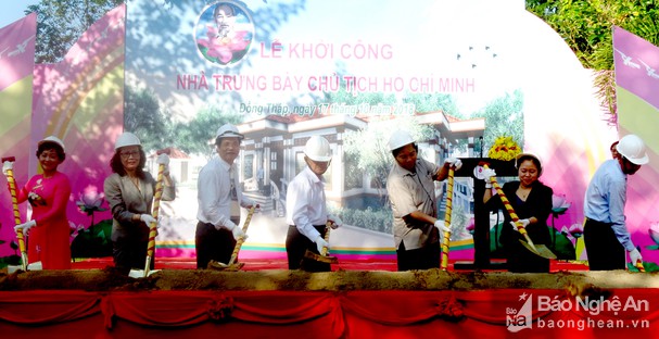 Đại biểu thực hiện nghi thức khởi công xây dựng Nhà trưng bày Chủ tịch Hồ Chí Minh. Ảnh: Nguyễn Toàn Ông Nguyễn Hữu Lý cho rằng, đây là công trình lịch sử - văn hóa được xây dựng ghi dấu giai đoạn phát triển mới của Khu di tích Nguyễn Sinh Sắc, thể hiện đạo lý “uống nước nhớ nguồn, ăn quả nhớ người trồng cây” của dân tộc ta; sự quan tâm của Đảng, Nhà nước, ý nguyện của toàn dân nhằm giáo dục truyền thống cách mạng cho thế hệ trẻ hôm nay và mai sau.