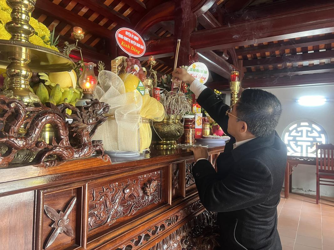 Đồng chí Nguyễn Xuân Đức, Tỉnh uỷ viên, Bí thư huyện uỷ Nam Đàn dâng hương tưởng niệm cụ Phan Bội Châu.