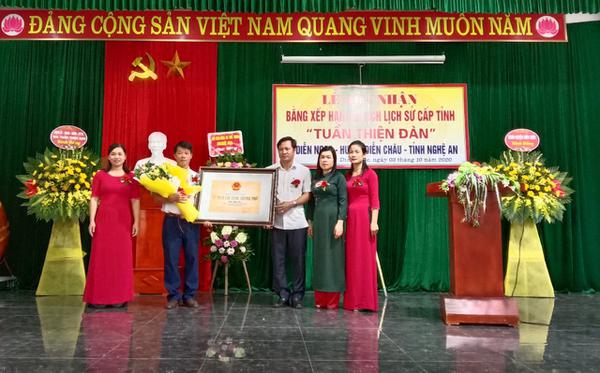 Bà Quách Thị Cường - Phó Giám đốc Sở Văn hóa và Thể thao Nghệ An trao bằng xếp hạng di tích cấp tỉnh Tuần Thiện Đàn cho chính quyền địa phương
