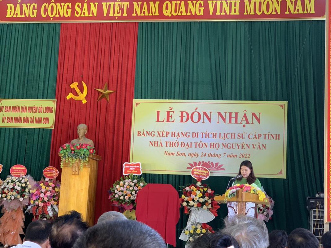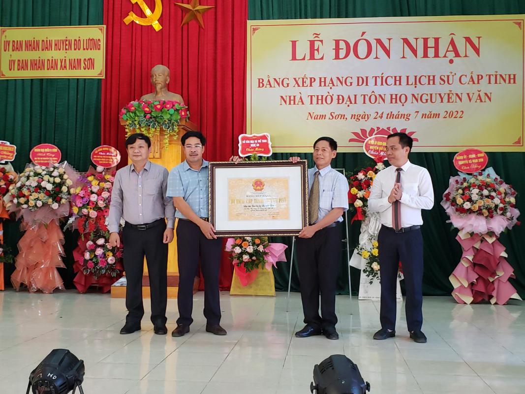 Sáng ngày 24 tháng 7 năm 2022 (tức ngày 25 tháng 06 năm Nhâm Dần), UBND huyện Đô Lương phối hợp với UBND xã Nam Sơn cùng con cháu dòng họ Nguyễn Văn long trọng tổ chức lễ đón nhận bằng xếp hạng di tích lịch sử cấp tỉnh nhà thờ đại tôn họ Nguyễn Văn xã Nam Sơn, huyện Đô Lương, tỉnh Nghệ An.