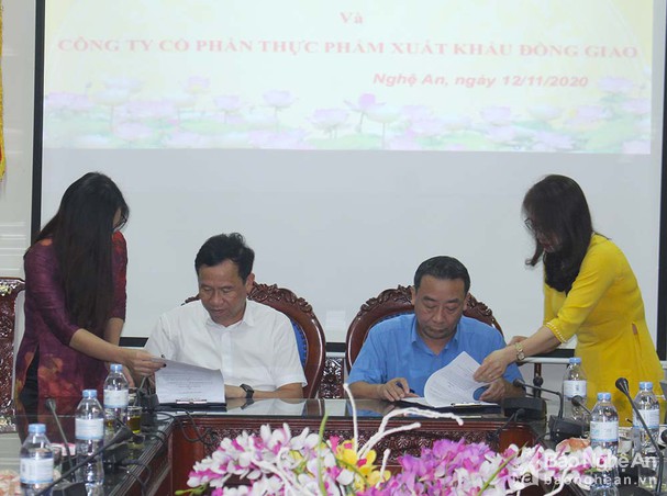 Giám đốc Sở Nông nghiệp và PTNT Nguyễn Văn Đệ và Chủ tịch HĐQT, Tổng giám đốc Công ty CP Xuất nhập khẩu Đồng Giao ký kết Biên bản ghi nhớ hợp tác. Ảnh: Phú HươngPhát biểu tại lễ ký kết, đồng chí Hoàng Nghĩa Hiếu cho biết, hiện một số doanh nghiệp đã đầu tư phát triển vùng nguyên liệu cây ăn quả và chế biến nước hoa quả tại Nghệ An và đạt được những kết quả ban đầu khá khả quan. Đây cũng là lĩnh vực mà Nghệ An rất có tiềm năng cả về diện tích đất đai tập trung, điều kiện khí hậu và khả năng canh tác của người nông dân. Đề nghị các bên liên quan triển khai nhanh các thủ tục cần thiết để nhà máy được xây dựng và đi vào hoạt động đúng tiến độ dự kiến.