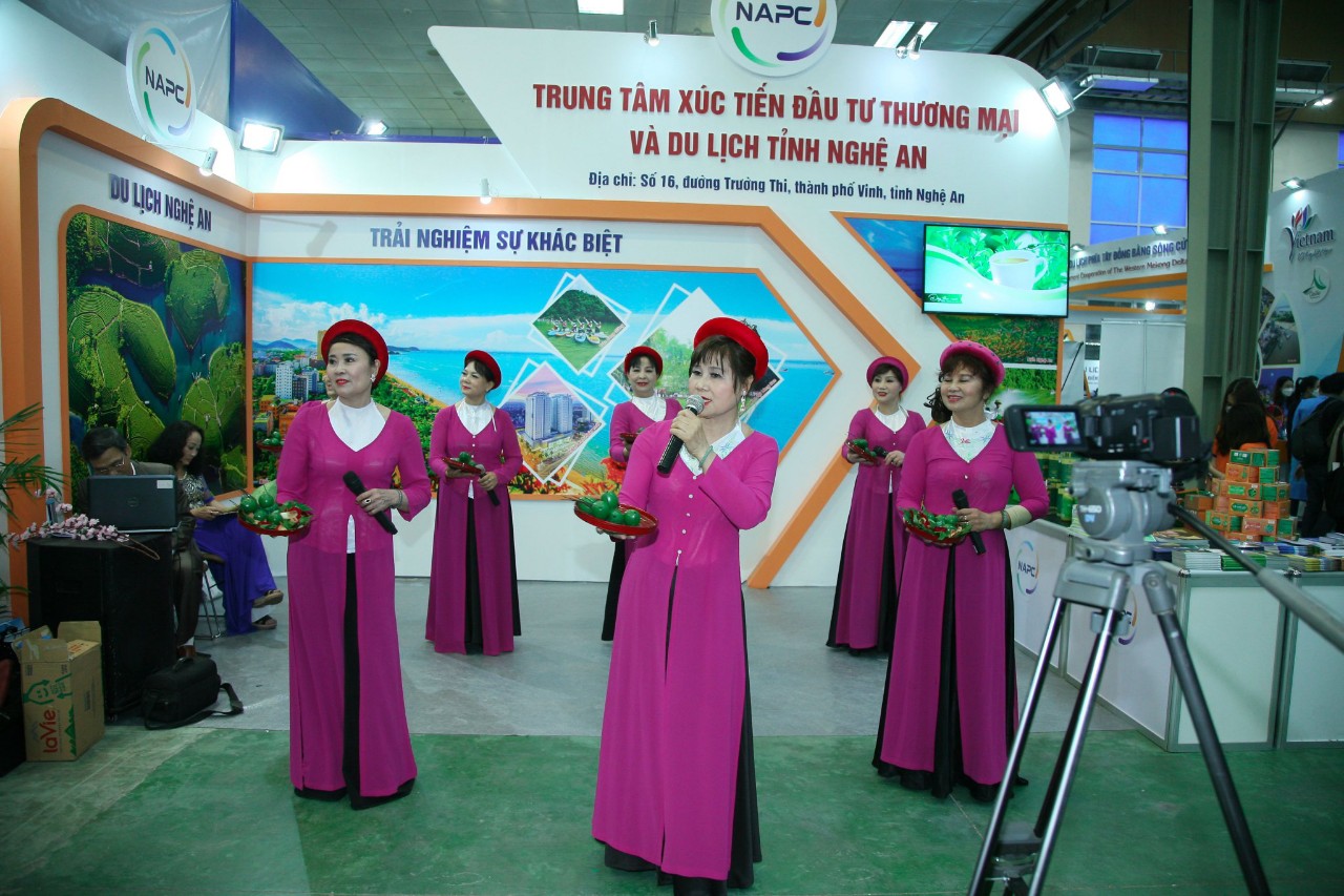 Năm nay, đoàn tỉnh Nghệ An do ông Nguyễn Văn Nam – Phó giám đốc Trung tâm xúc tiến đầu tư thương mại và du lịch Nghệ An làm trưởng đoàn đã tham gia hội chợ với nhiều hoạt động phong phú nhằm quảng bá, xúc tiến cho các hoạt động du lịch Nghệ An sau 2 năm ảnh hưởng bởi dịch covid. Tổng cục trưởng Tổng cục Du lịch Việt Nam Nguyễn Trùng Khánh, Phó Tổng cục trưởng Tổng cục Du lịch Việt Nam Hà Văn Siêu đã đến thăm gian hàng và đánh giá gian hàng tỉnh Nghệ An thiết kế đẹp mắt, ấn tượng, kết hợp hài hòa, hiệu quả với hoạt động biểu diễn Dân ca Ví Giặm Xứ Nghệ đặc sắc không chỉ góp phần thu hút đông đảo du khách đến tham quan, mua sắm các chương trình tour, dịch vụ du lịch, đặc sản ẩm thực Nghệ An tại đây mà còn giới thiệu được những nét riêng của loại hình du lịch văn hóa mà đã được tổ chức UNESCO công nhận là Di sản văn hóa thế giới phi vật thể này. Trong 2 năm qua, sản phẩm dịch vụ du lịch của Nghệ An vẫn tiếp tục được hoàn thiện và đã có nhiều nét đặc sắc mới mẻ, đặc biệt là ở khu vực phía Tây Nghệ An. Và đây cũng là một trong những điểm nhấn du khách quan tâm khi đến tìm hiểu về du lịch Nghệ An tại Hội chợ VITM 2022. Dịch vụ du lịch, đặc sản giới thiệu gian hàng Nghệ An.