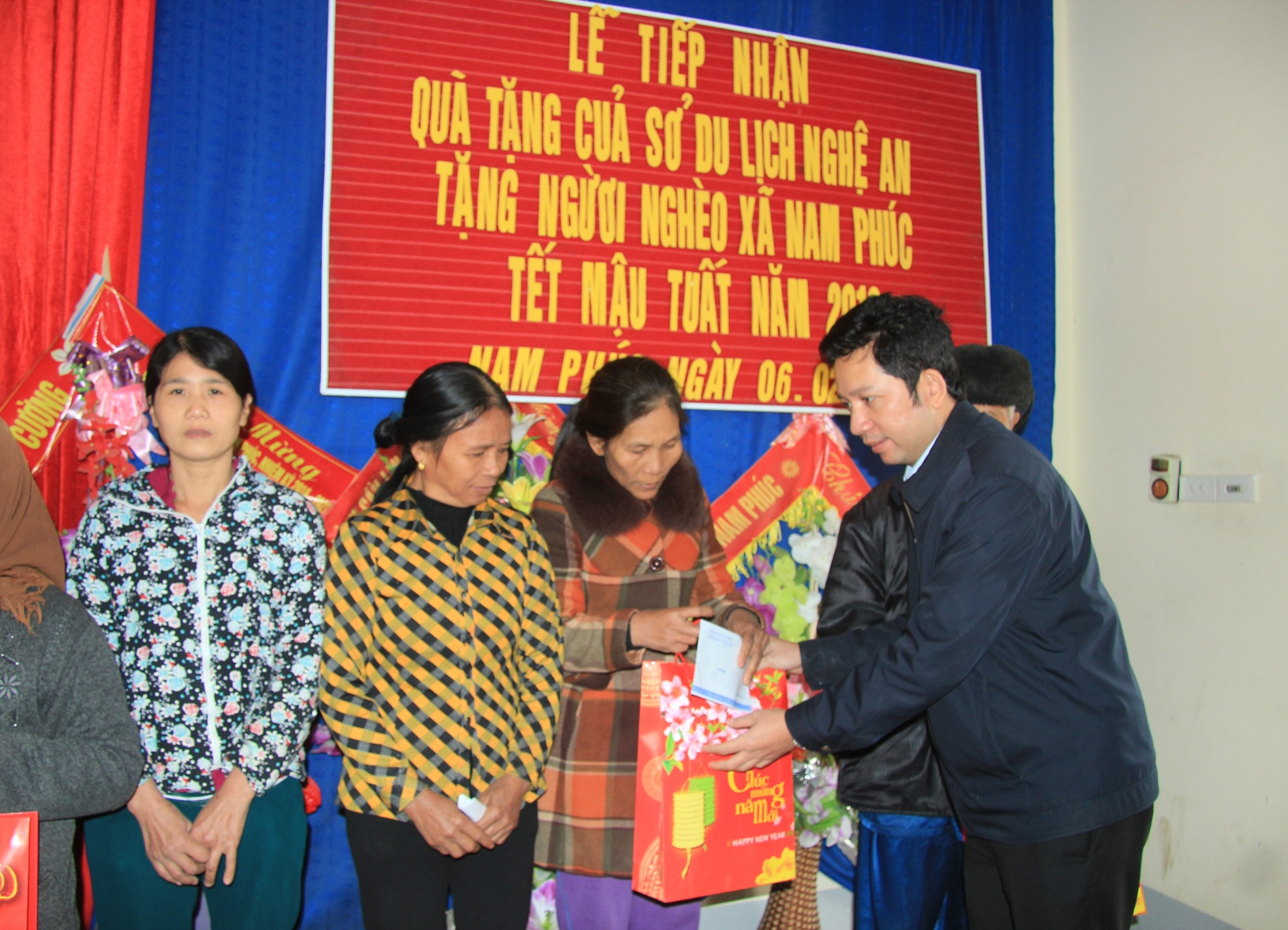 Trong 2 ngày mồng 5/2 và 6/2/2018 Sở Du lịch tổ chức thăm, tặng quà cho người nghèo trên địa bàn tỉnh. Đoàn công tác do đồng chí Nguyễn Mạnh Cường – Giám đốc Sở làm trưởng đoàn cùng các đồng chí Dương Hoàng Vũ – Phó GĐ Sở - Chủ tịch công đoàn; đồng chí Nguyễn Mạnh Lợi, Nguyễn Thị Thành An - Phó Giám đốc Sở cùng cán bộ công chức đã đến thăm, tặng quà và chúc Tết tại xã Vĩnh Sơn, huyện Anh Sơn, xã Nam Phúc, Nam Thượng huyện Nam Đàn.
