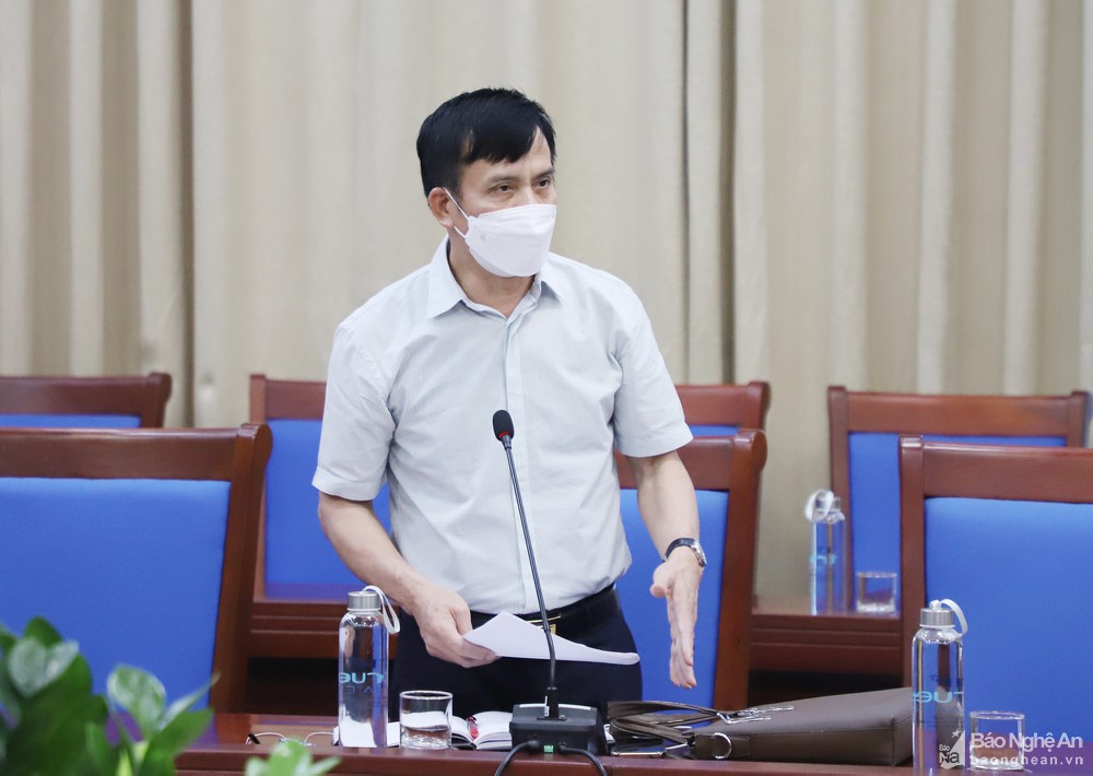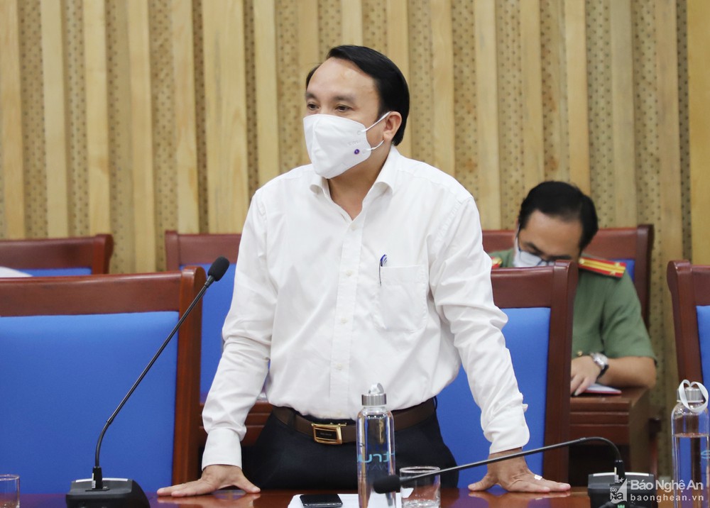 Giám đốc Sở Y tế Dương Đình Chỉnh báo cáo nhanh tình hình dịch Covid-19 trên địa bàn tỉnh. Ảnh: Phạm BằngChủ tịch UBND TP. Vinh Trần Ngọc Tú cho biết, hiện công tác điều tra, truy vết các ca lây nhiễm trên địa bàn, đặc biệt là các ca mới ghi nhận đang được thực hiện quyết liệt. Bên cạnh đó, TP. Vinh cũng đã chuẩn bị địa điểm cách ly tại các khách sạn đảm bảo cho khoảng 800 người và đang tiếp tục khảo sát thêm các địa điểm cách ly khác.