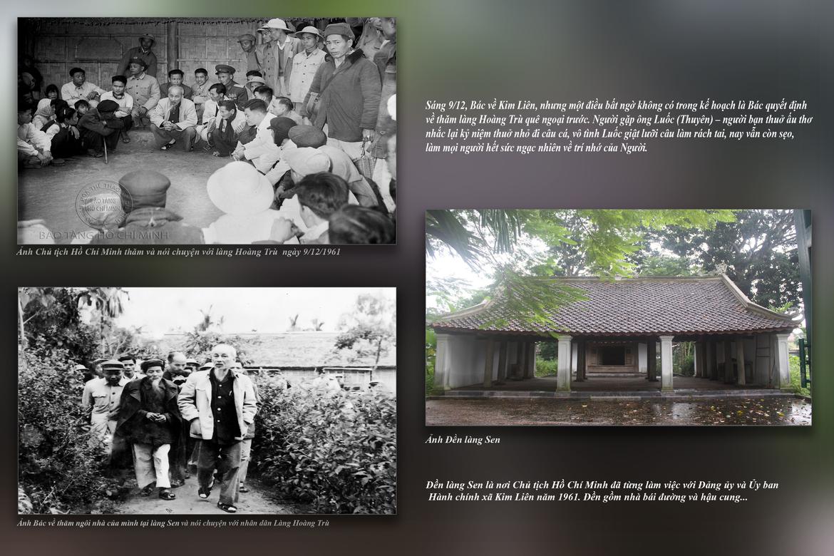 Trưng bày giới thiệu đến công chúng những hình ảnh, tư liệu về các di tích, địa điểm gắn liền với tuổi thơ của Người và ghi dấu sự kiện hai lần Bác Hồ về thăm quê. Bộ trưng bày gồm hai chủ đề: