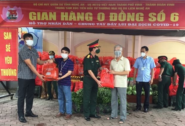 Cuối tháng 8/2021, tình hình dịch Covid 19 tại địa bàn thành phố Vinh cũng như toàn tỉnh Nghệ An diễn biến phức tạp hơn, UBND tỉnh đã ra quyết định số 3090/QĐ-UBND ngày 22/8/2021 về bổ sung một số biện pháp cấp bách đối với công tác phòng chống dịch Covid-19 trên địa bàn thành phố Vinh. Với phương châm “vượt qua khó khăn, đẩy lùi đại dịch”, Trung tâm đã phối hợp với Bộ chỉ huy Quân sự tỉnh gấp rút thực hiện “Gian hàng 0 đồng” nhằm trao nhu yếu phẩm, lương thực cho người nghèo, gia đình đặc biệt khó khăn trên địa bàn thành phố Vinh. Kêu gọi, vận động các doanh nghiệp hỗ trợ hàng tấn rau củ quả, lương thực, thực phẩm cho các “gian hàng 0 đồng”. Qua hơn 01 tuần nỗ lực triển khai đã đạt được nhiều kết quả nổi bật, được chính quyền, các cấp, các ngành ghi nhận. Đây là một hoạt động vô cùng ý nghĩa, kịp thời, thiết thực, thể hiện sự chung tay cùng cộng đồng sớm đẩy lùi đại dịch, ổn định cuộc sống của Trung tâm Xúc tiến Đầu tư, Thương mại và Du lịch.