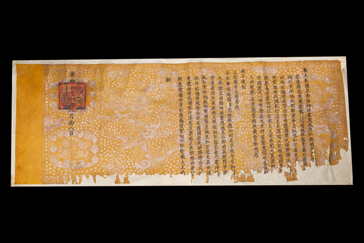 Sắc cho Đại Càn Quốc Gia Nam Hải Thần chiêu Linh ứng, Cảm huệ Hoằng tế, Minh nghĩa Hiển Đức, Trang thanh Tấn đạt, Cảm đức Hi tải, Mục trưng Trinh thuận, Đoan thục Trang ý, Nhu gia Quang túc, Bác đức Thuần nhân, An bảo Thuần mẫn, Cương đoán Cẩn tiết, Trinh thục Từ hòa, Phương dung Mỹ đôn, An bảo Phù tộ, Hựu quốc Trợ uy, Tán trị Hiệp an, Hộ quốc Khang dân, Trợ thắng Tề trị, Trinh tĩnh Anh linh, Dực vận Phù quốc, Thận hành Thuần mỹ, Trinh khiết Đoan chính, Trang thuận Mậu công, Dũng trí Hiển ứng, Quy Lĩnh Linh Từ, Tứ Vị Thánh Nương Đại Vương. Đạo thừa trời cao, chất thiêng đất dày. Giúp nước che dân, muôn đời ngưỡng trông ngầm giúp đỡ; ngăn tai trừ nạn, vạn thưở công lao rực rỡ. Linh thiêng tỏ rõ, đáng ghi phẩm trật, trải nêu rạng điển. Vì Tự vương tiến phong vương vị, ngự ngôi chính phủ, tôn phù xã tắc, củng cố cơ đồ, lễ có nâng bậc, cho nên được phong thêm ba chữ mỹ tự. Đáng phong thêm là Đại Càn Quốc Gia Nam Hải Thần chiêu Linh ứng, Cảm huệ Hoằng tế, Minh nghĩa Hiển Đức, Trang thanh Tấn đạt, Cảm đức Hi tải, Mục trưng Trinh thuận, Đoan thục Trang ý, Nhu gia Quang túc, Bác đức Thuần nhân, An bảo Thuần mẫn, Cương đoán Cẩn tiết, Trinh thục Từ hòa, Phương dung Mỹ đôn, An bảo Phù tộ, Hựu quốc Trợ uy, Tán trị Hiệp an, Hộ quốc Khang dân, Trợ thắng Tề trị, Trinh tĩnh Anh linh, Dực vận Phù quốc, Thận hành Thuần mỹ, Trinh khiết Đoan chính, Trang thuận Mậu công, Dũng trí Hiển ứng, Linh biến Bác trạch Diễn khánh, Quy Lĩnh Linh Từ, Tứ Vị Thánh Nương Đại Vương.