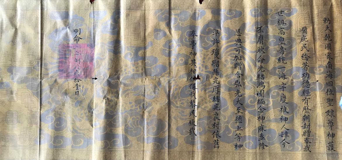 Sắc chỉ Nghệ An tỉnh, Quỳnh Lưu huyện, Phú Lương thôn tòng tiền phụng sự Hàm hoằng Quang đại Chí đức Phổ bác Hiển hóa Trang huy Đại Càn Quốc Gia Nam Hải Tứ Vị Thượng đẳng thần. Tiết kinh ban cấp sắc phong, chuẩn kỳ phụng sự. Tự Đức tam thập nhất niên, chính trị trẫm ngũ tuần đại khánh tiết, kinh ban bảo chiếu đàm ân, lễ long đăng trật, đặc chuẩn y cựu phụng sự, dụng chí quốc khánh nhi thân tự điển.
