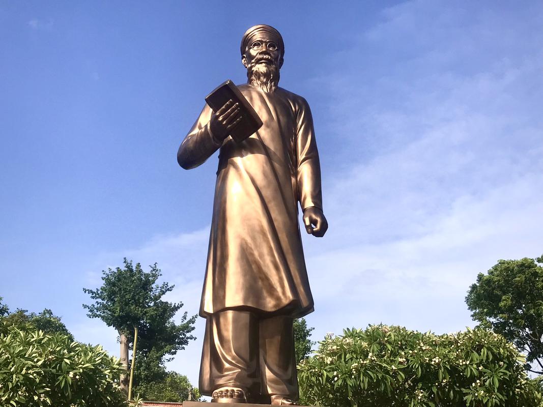 Tượng khắc họa hình ảnh của nhà chí sĩ yêu nước có tư tưởng vượt thời đại, một trí thức cách mạng tiêu biểu, một nhà văn hóa lớn của dân tộc Việt Nam. Điểm nhấn của bức tượng là khuôn mặt, vừa thể hiện được phong cách thanh tao của một nhà nho với vầng trán cao rộng, chùm râu dài lột tả nét thông thái, uyên thâm, vừa thể hiện tinh thần quật cường với nét mặt cương nghị, đôi mắt quắc thước, sáng ngời khí tiết của một sĩ phu trọn đời hiến dâng cho sự nghiệp đấu tranh giải phóng đất nước. Tay phải cầm sách, biểu tượng của một trí thức Nho học, tay trái buông, bàn tay nắm lại thể hiện quyết tâm ra đi tìm đường cứu nước. Tà áo vừa mềm mại, vừa tung bay, thể hiện sự thanh tao của một nhà Nho nhưng mang đậm khí chất của một chí sỹ yêu nước quyết tâm tìm đường giải phóng dân tộc trong bối cảnh xã hội đầy sóng gió.