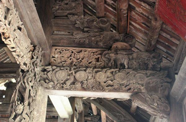 Về kiến trúc, các đình làng ở Nghệ An thường có bộ khung không to lớn, có lối kết cấu vì kèo theo kiểu “giá chiêng, chồng rường”, một lối kết cấu khá phổ biến ở Việt Nam trong giai đoạn thế kỷ XVII – XVIII. Kết cấu này kế thừa và phát triển kết cấu “chồng rường” ở các thế kỷ trước, vừa đảm bảo sự chắc chắn, giải quyết hài hòa giữa chiều cao và độ dốc của mái, các bộ vì chịu lực bên trong, đến việc gắn kết các đơn nguyên lại với nhau trong một tổng thể đi liền. Hệ thống chồng rường, ván mê được sử dụng nhiều trong công trình từ vì nóc, cốn, bẩy hiên... vừa giúp cho kiến trúc có thể chịu đựng lâu dài với nắng, mưa, gió bão lại là “đất” để các nghệ nhân dân gian thỏa sức sáng tạo nghệ thuật.