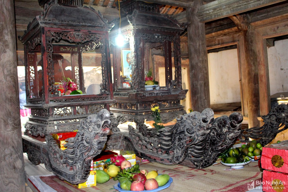 Đặc biệt tại đền còn lưu giữ một chiếc thuyền rồng độc đáo. Thuyền làm bằng gỗ với kích thước lớn, phía trên có thiết kế ngai thờ, xung quanh được chạm trổ đẹp. Thuyền cổ chỉ được đưa ra khỏi đền mỗi khi di tích tổ chức lễ hội truyền thống. Ảnh: Huy Thư