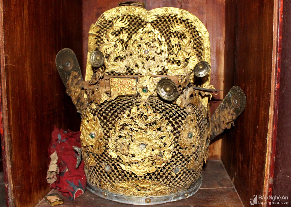 Một chiếc mũ thờ, trải qua hàng trăm năm vẫn rực sáng màu đồng. Ảnh: Huy Thư