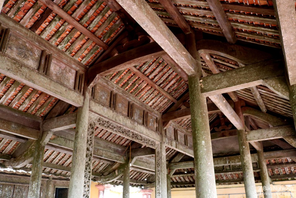 Đền có các công trình: nghi môn, bái đường, hạ, trung, thượng điện, tả, hữu vu. Trải qua nhiều lần tu tạo, đền vẫn giữ được kiến trúc xưa. Trên khung gỗ nhuốm màu thời gian của các công trình được điêu khắc, chạm trổ đẹp. Trong ảnh: Gian chính và trên những xà nhà của bái đường được chạm khắc ấn tượng với nhiều hoa văn và những chữ Hán lớn. Ảnh: Huy Thư