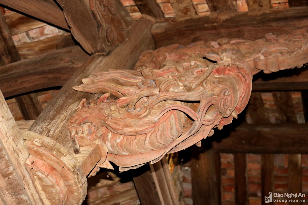 Cận cảnh đầu rồng gác cột trốn trong trung điện. Ảnh: Huy Thư