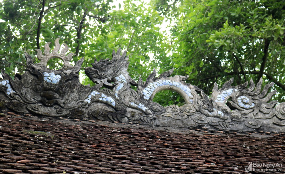 Nét đẹp độc đáo của đền Thanh Liệt không chỉ thể hiện ở phần gỗ với nghệ thuật điêu khắc tinh xảo, mà trên mái ngói của các điện thờ cũng được trang trí hấp dẫn với những hình lưỡng long chầu nguyệt sống động. Rất tiếc, do công trình đang xuống cấp nên một số chi tiết, bộ phận đã bị mối, mọt, rụng, gãy...Ảnh: Huy Thư.
