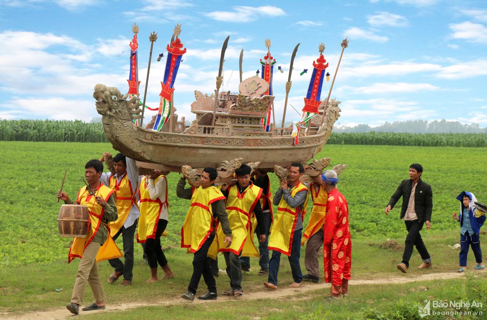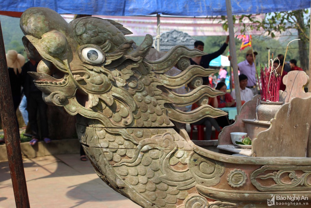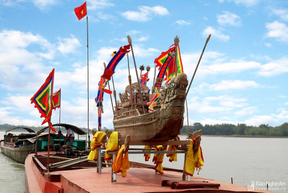 Trong lễ rước hến trên sông Lam, thuyền rồng cổ mang ý nghĩa tâm linh được người dân để ngự trên thuyền lớn. Ảnh: Huy Thư