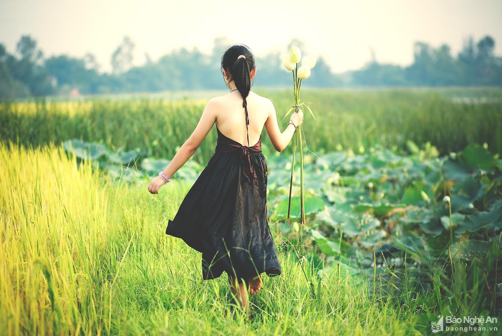 Đầm sen thường nằm cạnh những cánh đồng làng. Giữa mùa lúa chín, cô gái nhỏ chạy dài trên con đường nội đồng nhỏ bé chênh vênh, tay cầm đôi lá sen, hoa sen tung tẩy những điệu vũ hồn nhiên... Ảnh: Sách Nguyễn