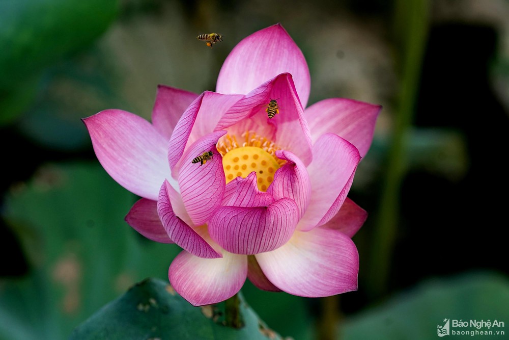 Hương sen thanh khiết thu hút những loài ong, bướm... đến hút mật. Hãy thử tưởng tượng một ban mai trong veo, nhẩn nha "sống chậm" bên hồ sen thơm ngát để cảm nhận một nhịp đời thật khác. Ảnh: Trung Hà