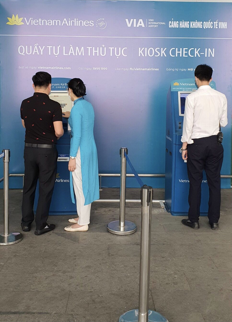 Hành khách check -in trực tuyến ở các Kiosk tại sân bay Vinh