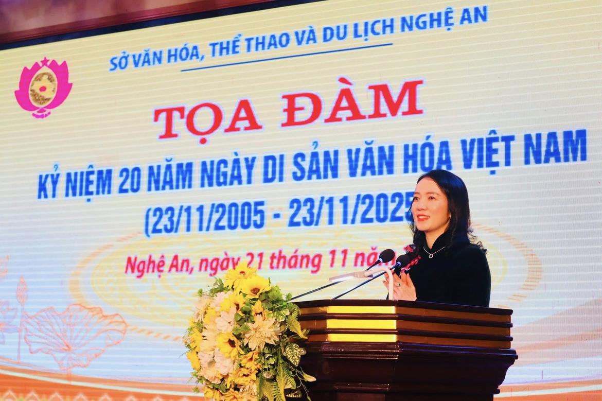 Phát biểu tại lễ kỷ niệm, bà Trần Thị Mỹ Hạnh - Giám đốc Sở Văn hóa, Thể thao và Du lịch nhấn mạnh: Di sản văn hóa là những giá trị cốt lõi của bản sắc cộng đồng, được kết tinh từ trí tuệ, tâm hồn Việt, là cội nguồn làm nên sức mạnh dân tộc, góp thành hình hài đất nước qua hàng nghìn năm lịch sử. Chính vì vậy, việc bảo vệ, phát huy giá trị di sản văn hóa, góp phần xây dựng và phát triển nền văn hóa Việt Nam tiên tiến, đậm đà bản sắc dân tộc đã được Đảng, Nhà nước ta xác định là mục tiêu, nhiệm vụ quan trọng. Giám đốc Sở ghi nhận những nỗ lực, cống hiến của “những chiến sĩ trên măt trận văn hóa” và tin tưởng rằng với cội nguồn sức mạnh tinh thần được tích lũy, cùng với trí tuệ, tâm huyết dành cho di sản, những người đang trực tiếp công tác trong ngành Văn hóa, Thể thao và Du lịch nói chung, lĩnh vực di sản văn hóa nói riêng sẽ gìn giữ, bồi đắp ngọn lửa đam mê với những giá trị truyền thống, góp phần lan tỏa “hồn quê” xứ Nghệ đến bè bạn muôn phương.
